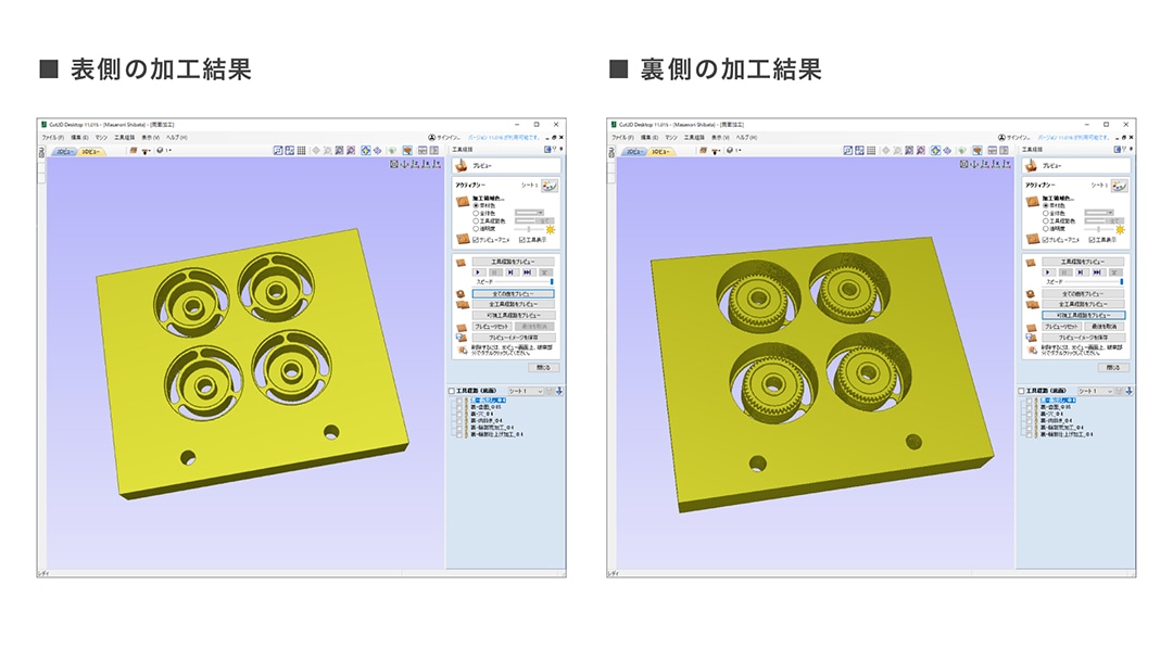 NCプログラムの作成には、「Cut2D」を使用しました。「Cut2D」には両面加工に対応する便利な機能が標準で搭載されています。