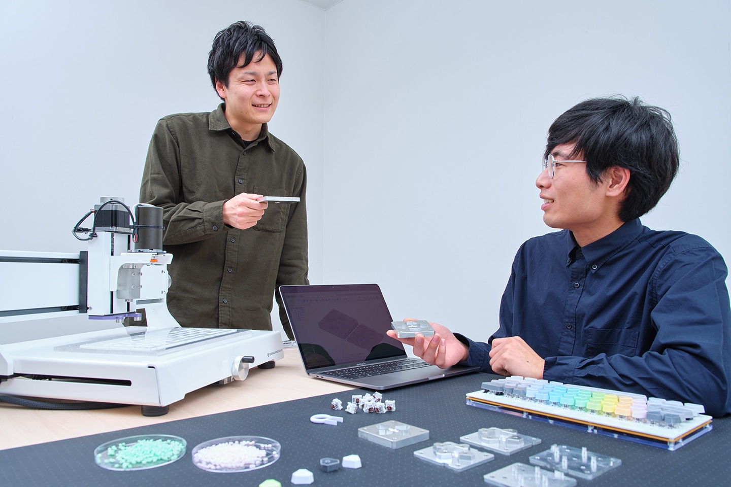 メカエンジニア職の業務体験では、当社製品を使った加工サンプルの考案に取り組みます。実際の製品を前に、「この機械で何ができるか」「どう使えば面白いか」を考え、試行錯誤しながらアイデアを形にしていきます。単なる見学ではなく、手を動かしながら、製品開発の考え方や流れを体感できます。
