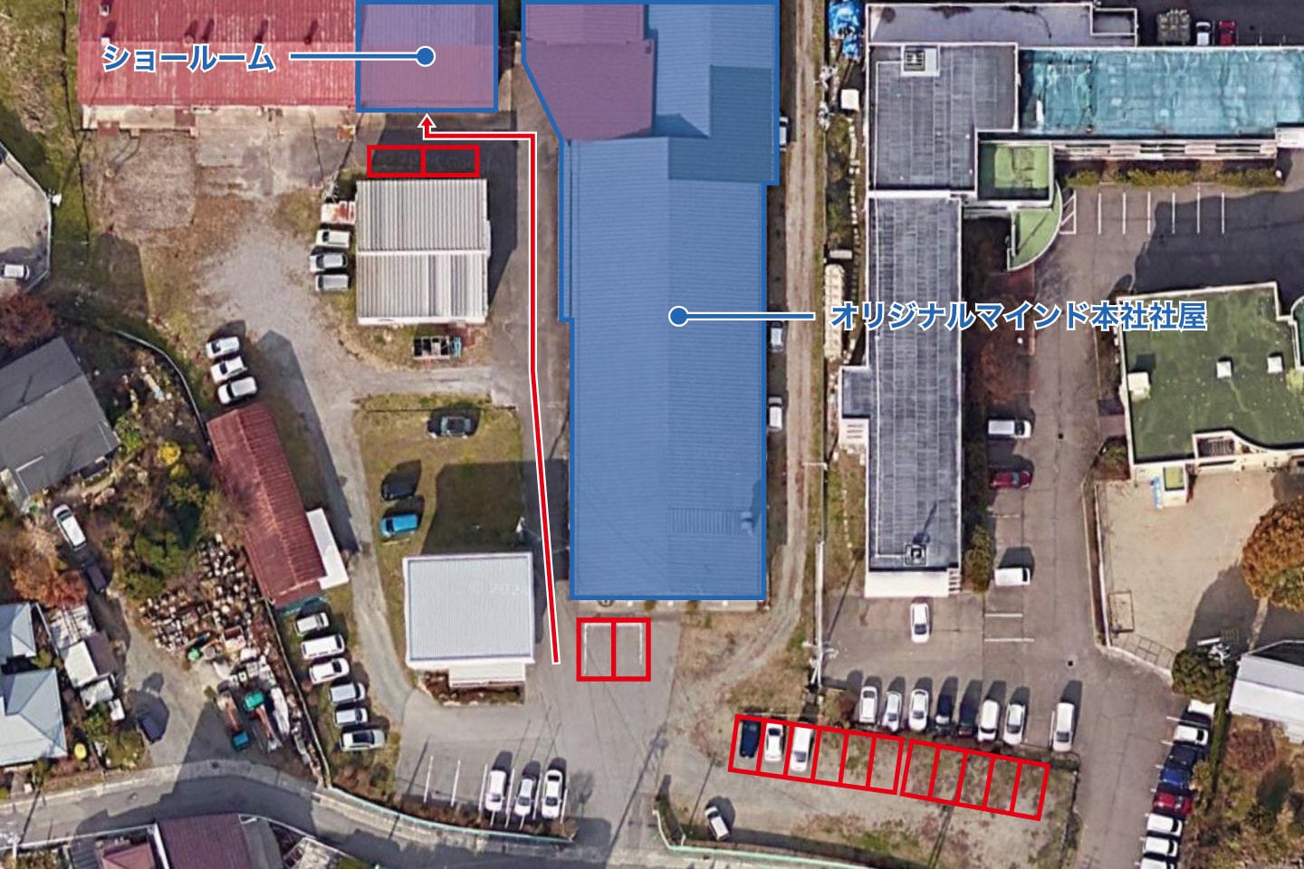会社前に駐車場をご用意しております。下図赤枠内のスペースをご利用ください。オリジナルマインド本社社屋前の駐車場をご利用の場合は、駐車後に図中の矢印に沿って社屋の横をお進みいただくと、左手にショールームの建物がございます。なお、ショールーム前にも駐車いただけるスペースがございますが、塗装工事の足場があり狭くなっておりますのでご注意ください。