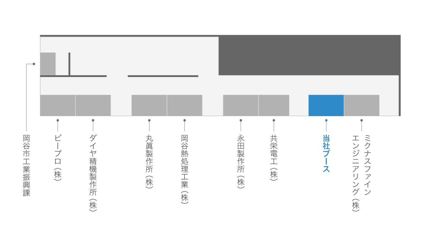 下図は、岡谷市の共同ブースに参加する企業の一覧と、ブース内での配置を示した図です。当社を含めて計 8 社の企業が参加します。ブース番号は A館 5-1 で、A館出入口から入ってすぐ左手側に位置しています。ご来場の際は、ぜひお立ち寄りください。