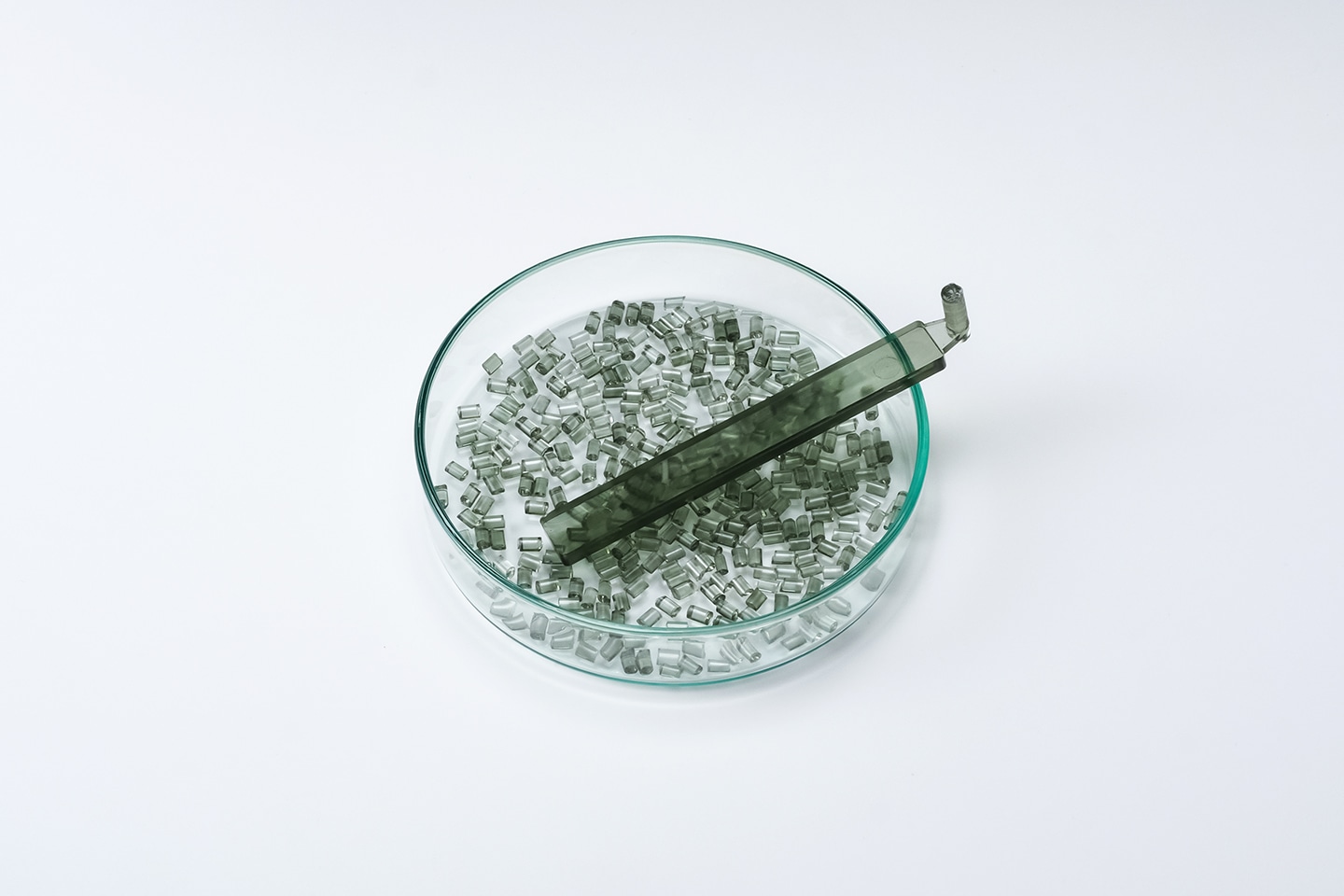CONERI はコンパクト設計を重視しており、一軸の短いスクリューを採用しています。そのため、大型の混練機に比べて混練性が不足する場合があります。このサンプルでは、透明な PS にドライカラー(粉状の着色剤)を少量添加し、成形品の色ムラを可視化することで、混練性の参考としました。