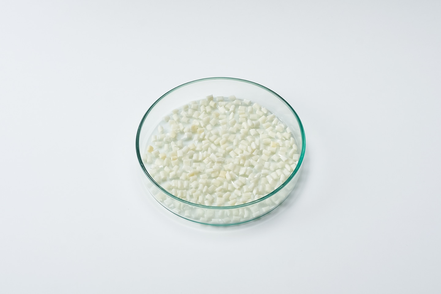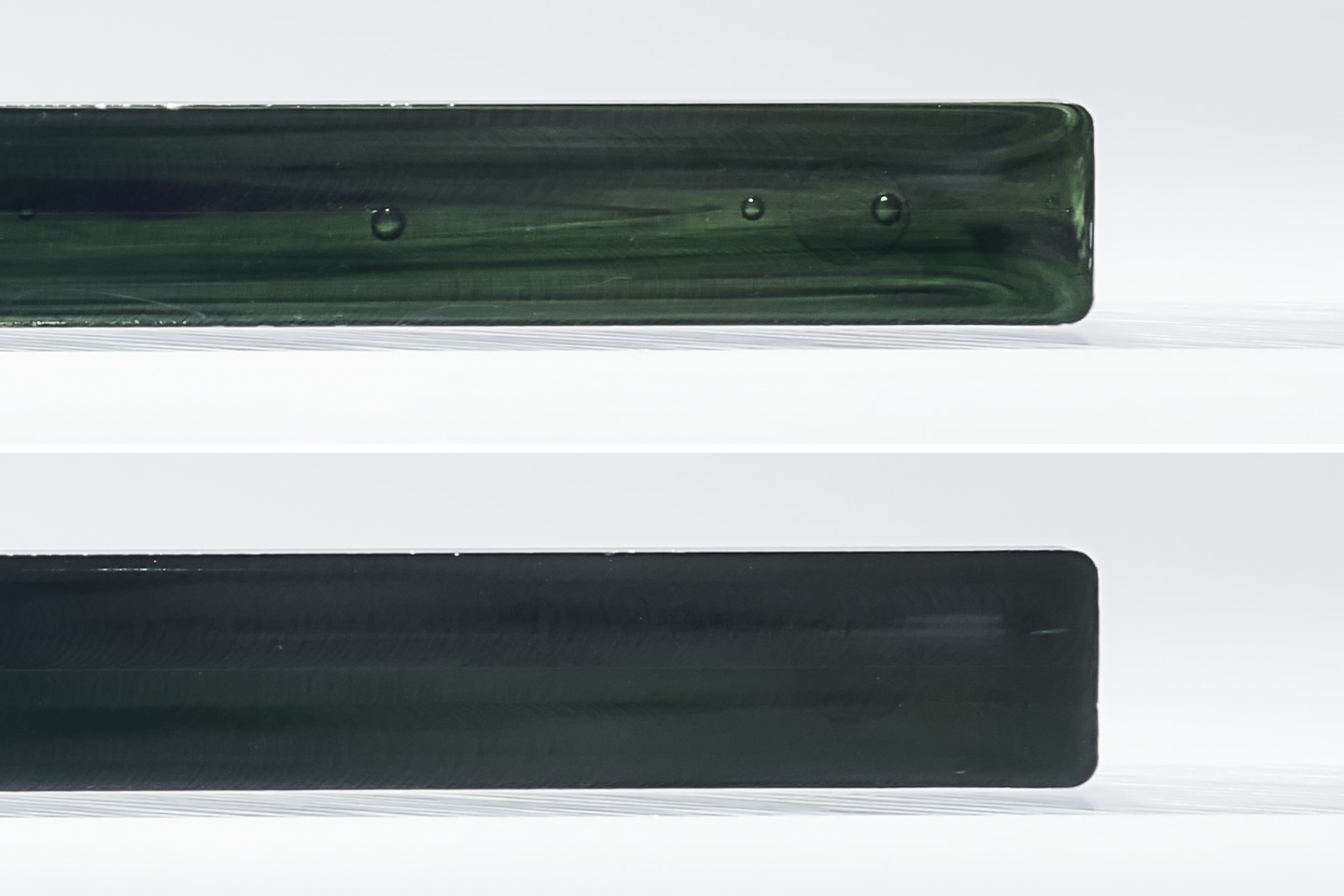 混練 1 回のサンプルを光に透かして見ると、やや色ムラがありました。一方で、一度ペレット化した材料を CONERI で再度ペレット化した混練 2 回のサンプルは、色ムラが大きく改善し、より均一な外観となりました。