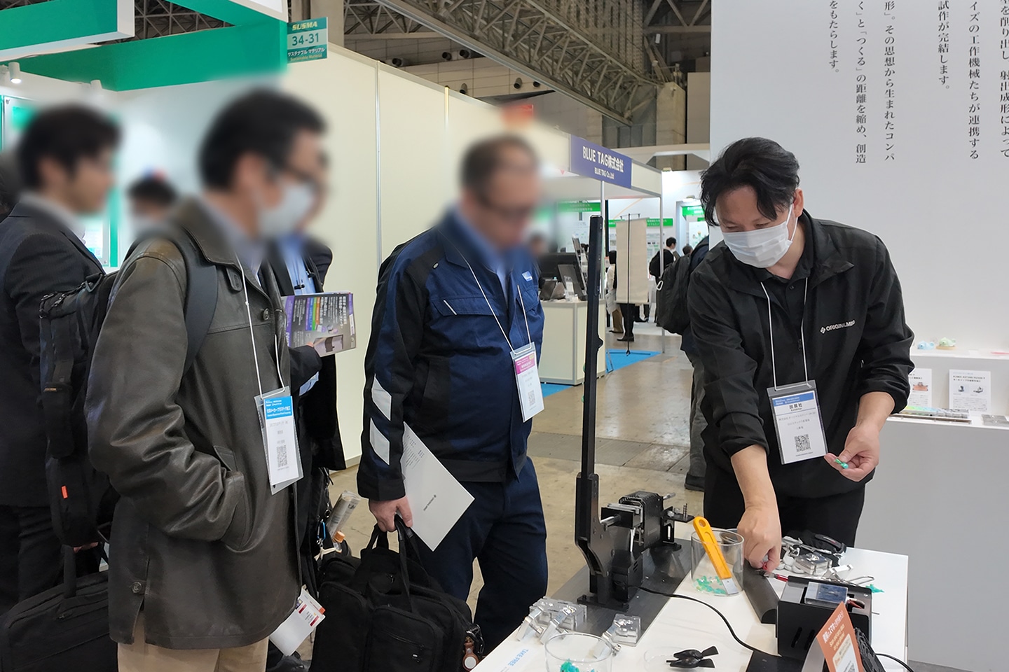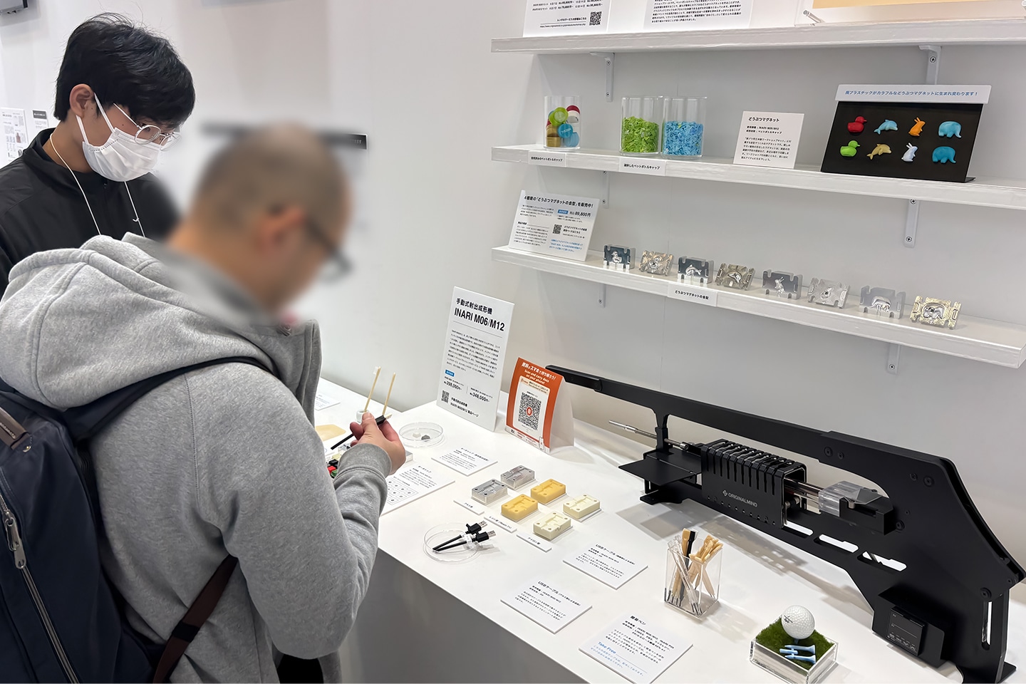 ブース左側では、手動式射出成形機「INARI M06」による、ペットボトルキャップを材料とした「どうぶつマグネット」の成形を実演しました。手動で射出成形ができる点が注目を集め、多くの方に足をとめていただきました。実演中には、対応材料や最大成形容量など、仕様に関する具体的なご質問が数多く寄せられました。特に対応材料に関しては、端材からでも成形できることに興味を持たれる方が多く、リサイクルへの関心の高さを改めて感じました。