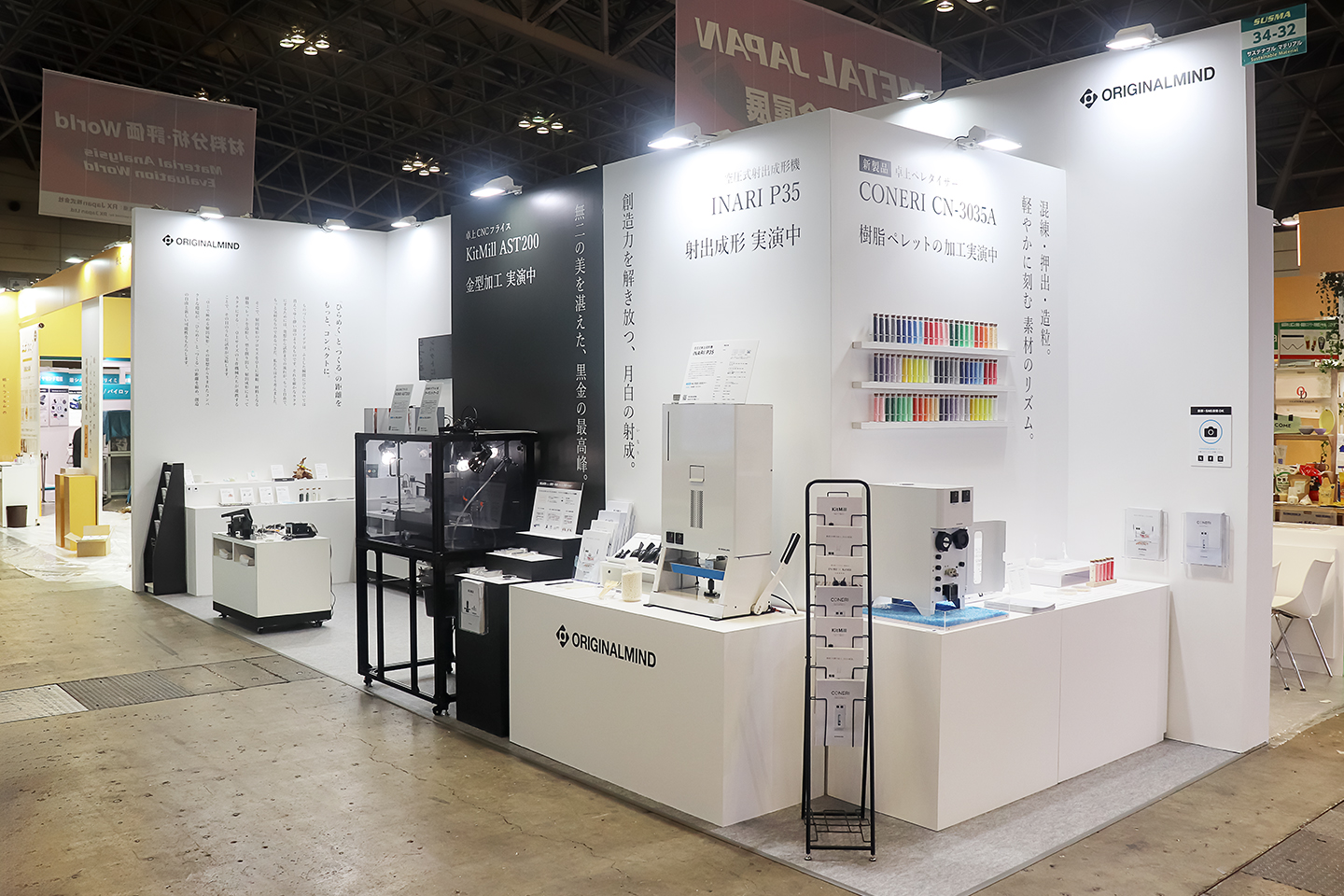ブース右側には、卓上ペレタイザー「CONERI CN-3035A」、空圧式射出成形機「INARI P35」、卓上CNCフライス「KitMill AST200」とオプション品の「クーラントケース」を並べて展示し、加工の実演を行いました。通路に沿って製品をご覧いただくことで、射出成形の一連のプロセスが卓上で完結する流れをイメージしていただけるレイアウトとしました。どの機種の実演も、たくさんの方が足をとめてご覧になっており、3 日間を通して来場者が途切れることのない、活気に満ちた展示となりました。