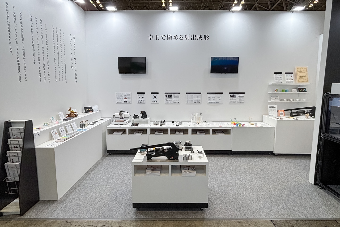 2025 年 5 月に開催された 大阪展での展示 に続き、今回も「卓上で極める射出成形」をメインテーマに掲げ、オリジナルマインドの卓上工作機械をセットでご紹介しました。各製品の展示と加工実演のほか、実際に製品を使って加工したサンプルをあわせて展示しました。