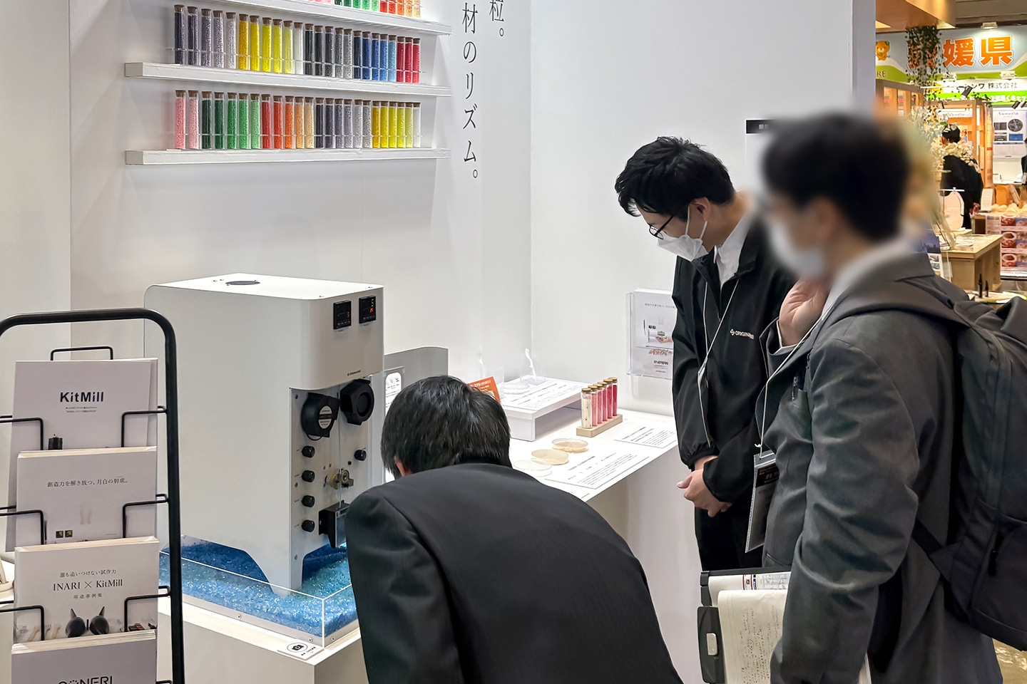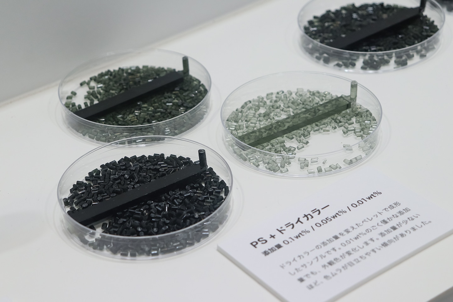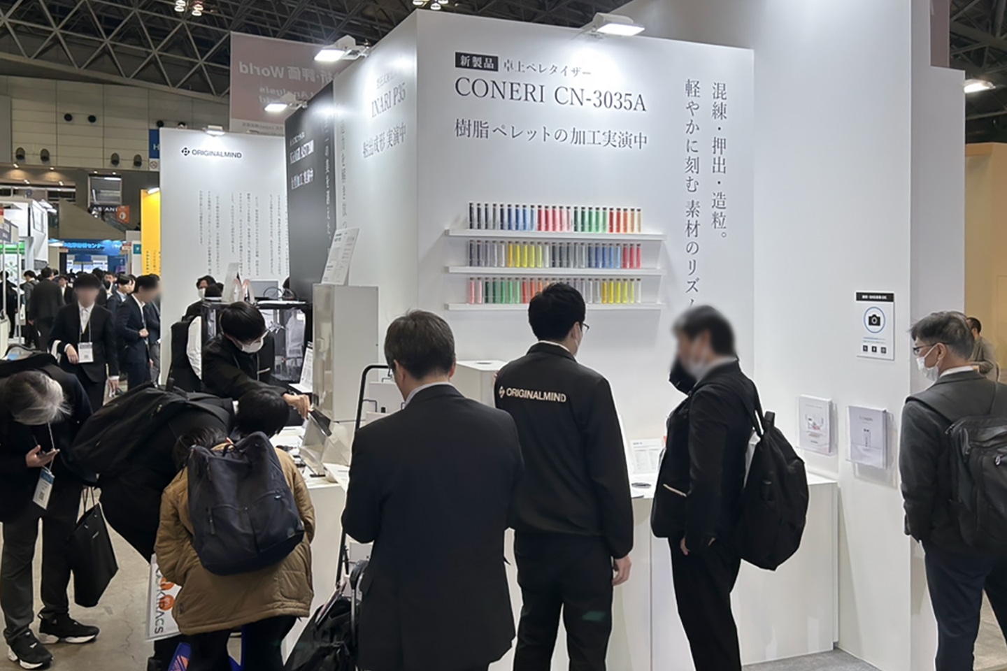加工サンプルの展示では、新しく発売された卓上ペレタイザー「CONERI」のサンプルを、前回の大阪展よりも大幅に増やしました。材料開発においても自由度の高い試作環境を実現できることを、サンプル展示と加工実演を通して体感いただけるブースを目指しました。
