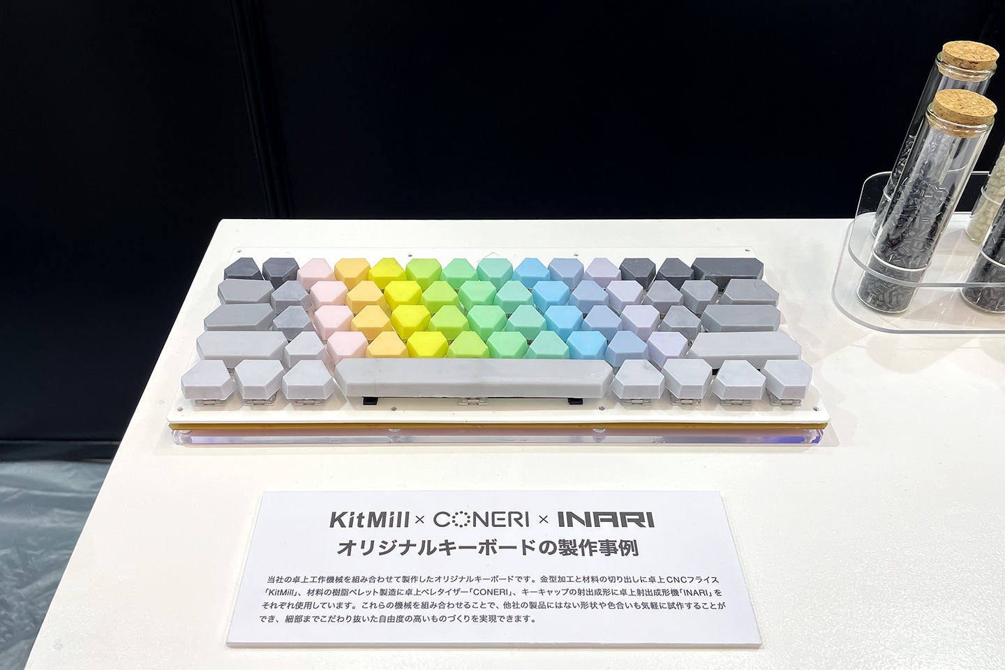 さらに、「CONERI」で混練したペレットや、オリジナルマインドの卓上工作機械を組み合わせて製作した「オリジナルキーボード」など、各種加工サンプルもあわせて展示しました。実際に機械が動くようすと、それらを用いて製作したサンプルをご覧いただくことで、初めて当社製品に触れる方にも、卓上での気軽なものづくりをイメージしていただけたのではないかと考えています。