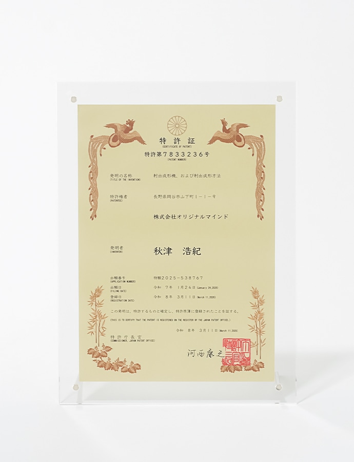 このたび株式会社オリジナルマインドは、空圧式射出成形機「INARI P35」に関する特許を取得しました。本特許は、金型の自動的な位置調整を行う構造に関するものであり、従来の射出成形機で必要とされていた熟練者による位置合わせ作業を不要にする技術です。