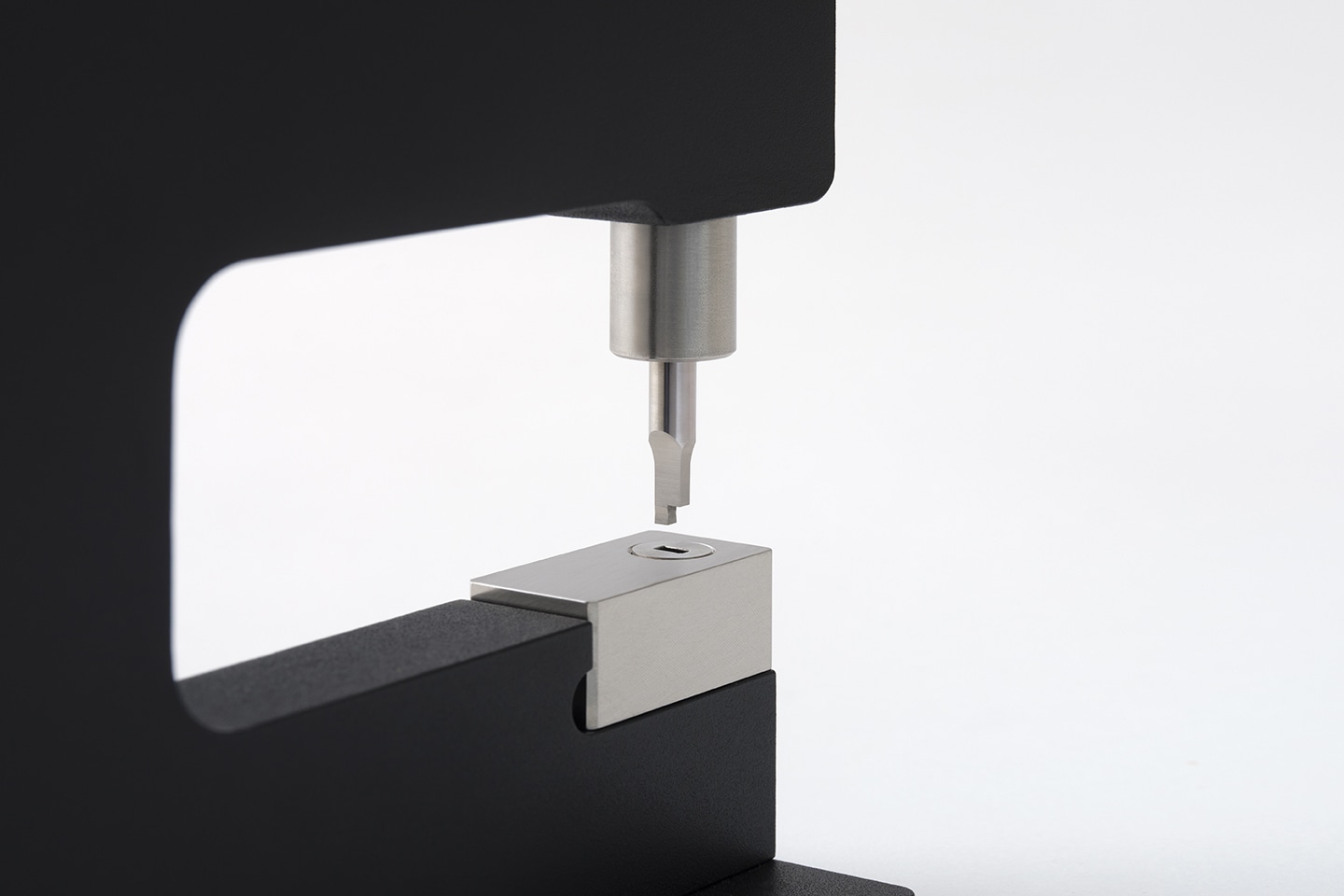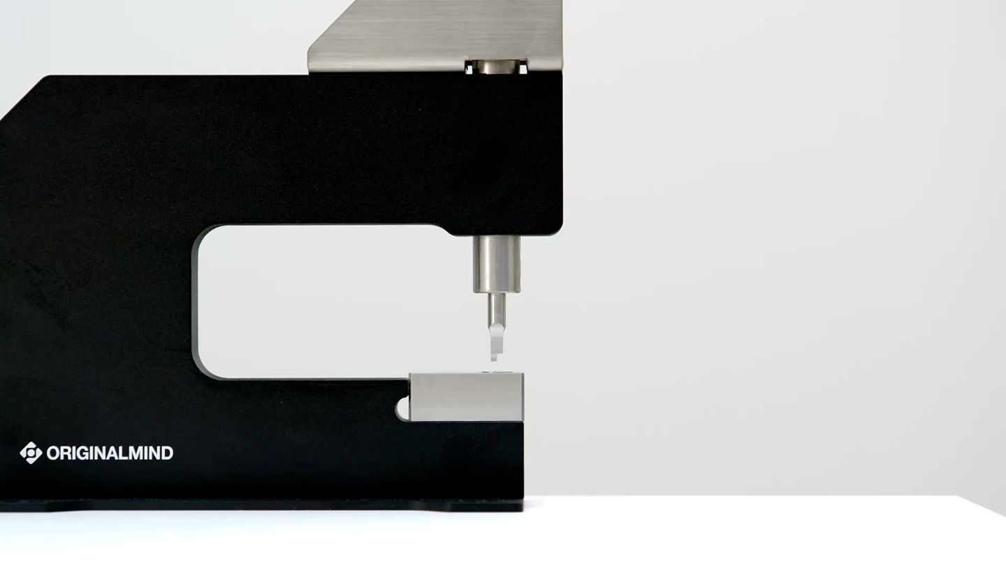 打ち抜き時に発生する力を確実に受け止めるため、リンク機構には両持ち構造を採用しました。U 字状の板金でリンク機構を挟み込むことで、構造全体の剛性を高め、変形を抑制しています。加工を繰り返しても打ち抜き精度や抜き心地が変わりにくく、ステンレスなど負荷のかかる材料に対しても、安心して加工を行うことができます。