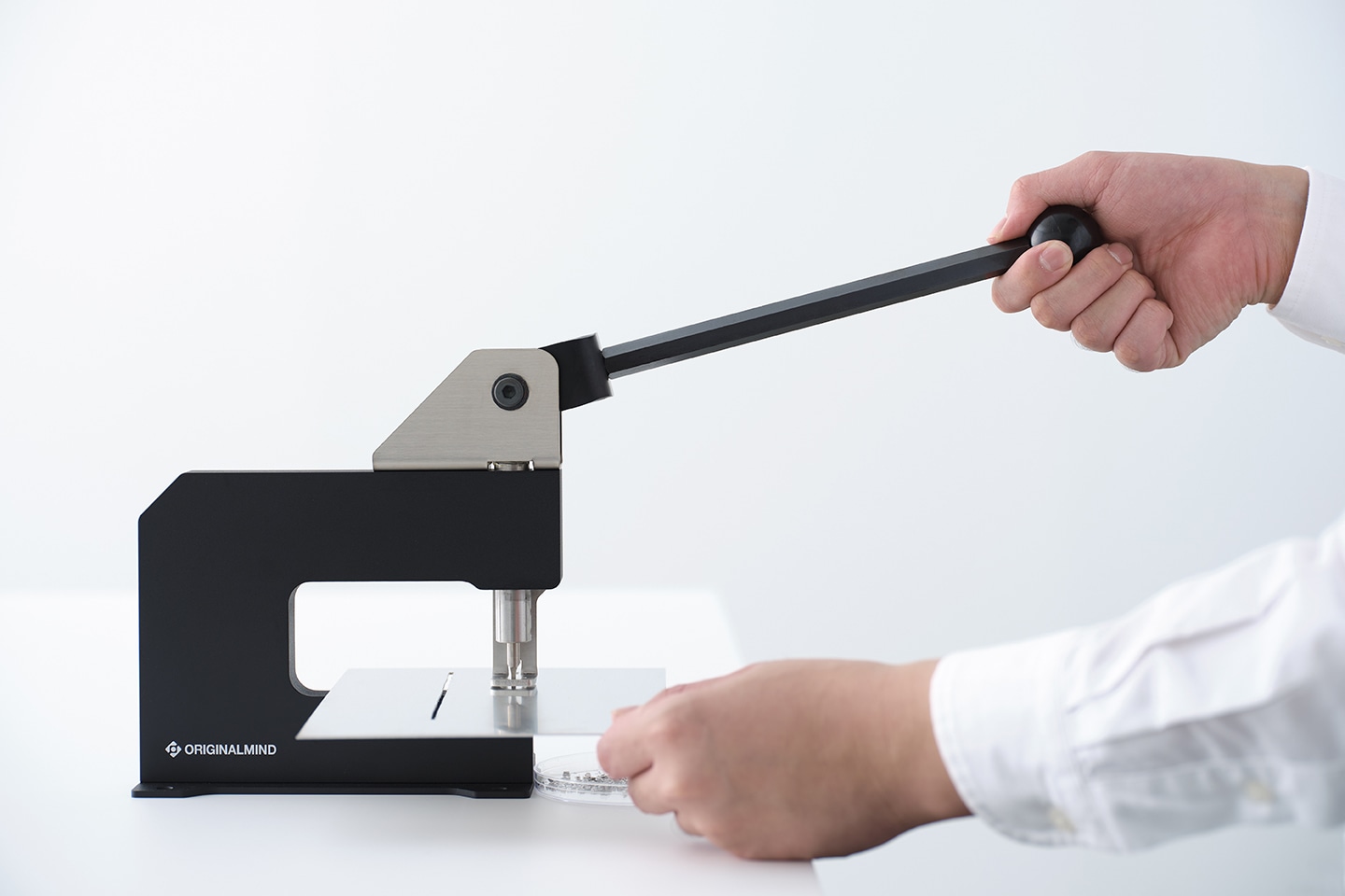卓上手動式パンチプレス「GOIGOI」は、そうした前提を覆すために生まれました。電気も下穴も必要なく、すぐに穴があけられるように。板金の切り抜きも、まるで缶切りのように軽快なものとなりました。