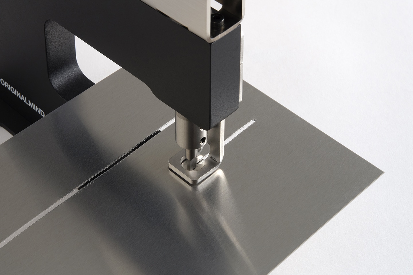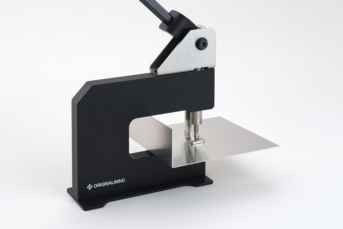 わずかな力で大きな力を生むトグルリンク機構の採用により、軽い操作で板金の打ち抜き加工が可能です。さらに、前機種からハンドルの角度と長さを見直すことで、卓上作業でも快適な操作感を実現しました。1mm 厚のアルミ板を抜く際に必要な力は約 3.5kg 程度で、作業時の負担を抑え、心地よく加工を続けることができます。