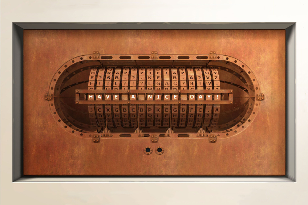 熊谷 文秀『Dialog machine』 バラバラな文字の集団から、意味のあるメッセージが発生していく様を可視化する装置。