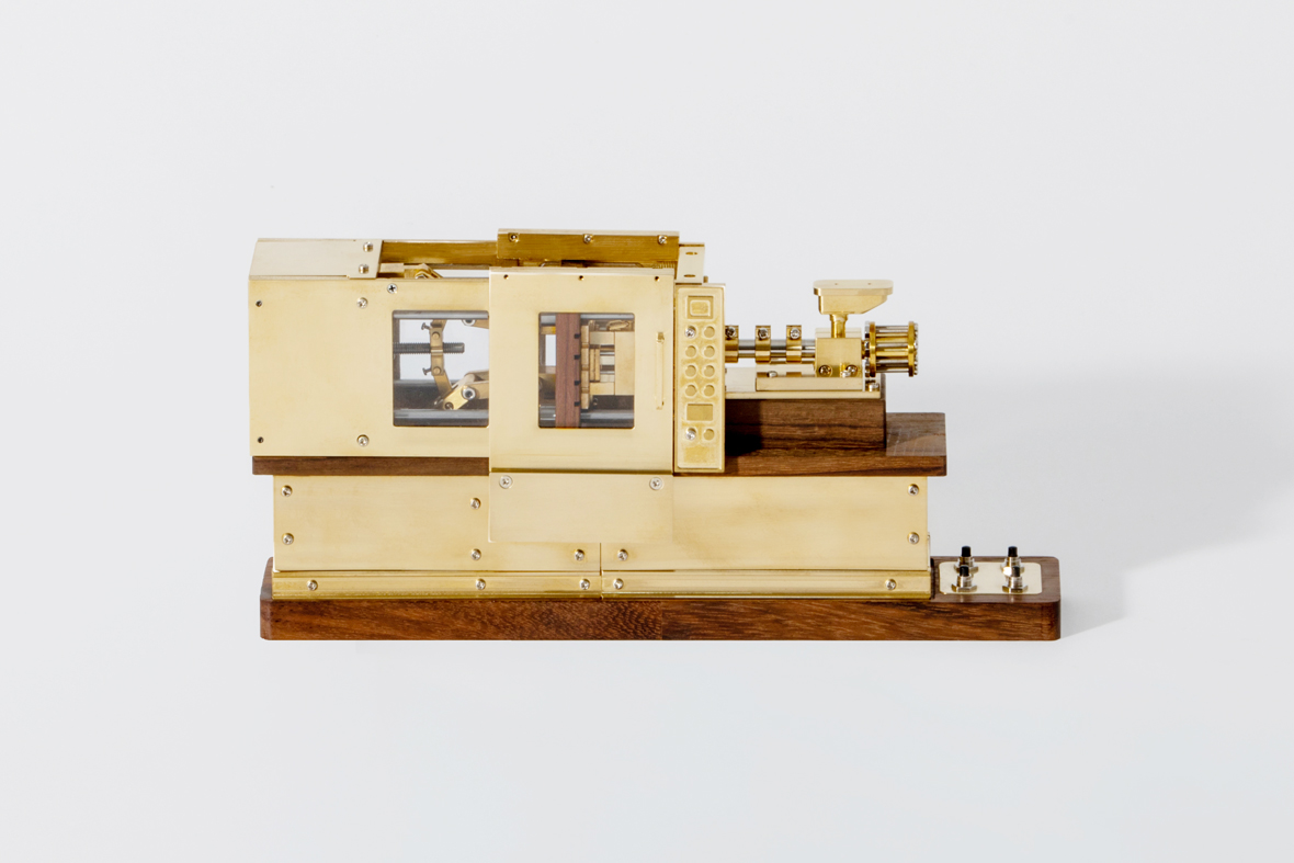 射出成形機とは、取り付けられた金型に溶融した樹脂を高圧で充填する機械のこと。日常目にするプラスチック用品のほとんどがこの射出成形機で作られている。本来、油にまみれた約850tもある巨大な機械が、1/48スケールというミニチュアサイズと、美しい真鍮製のボディで再現されている。実際の成形はできないものの、金型の開閉や型締め力の構造に、実物同様トグル式を採用するなど、金型設計士として実際の成形現場に従事する内田さんならではの細やかな視点が光る作品。