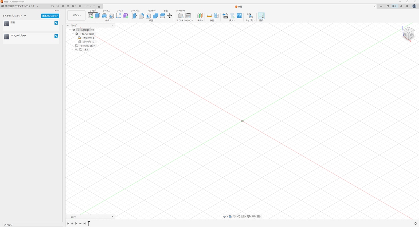 「Fusion」を起動し、これから作成するシンボル、フットプリント、パッケージを保存するためのプロジェクトを作成します。今回は 「PCB_ライブラリ」というプロジェクトを作成し、 その中にパッケージ保存用として「3D Models」フォルダを作成しました。