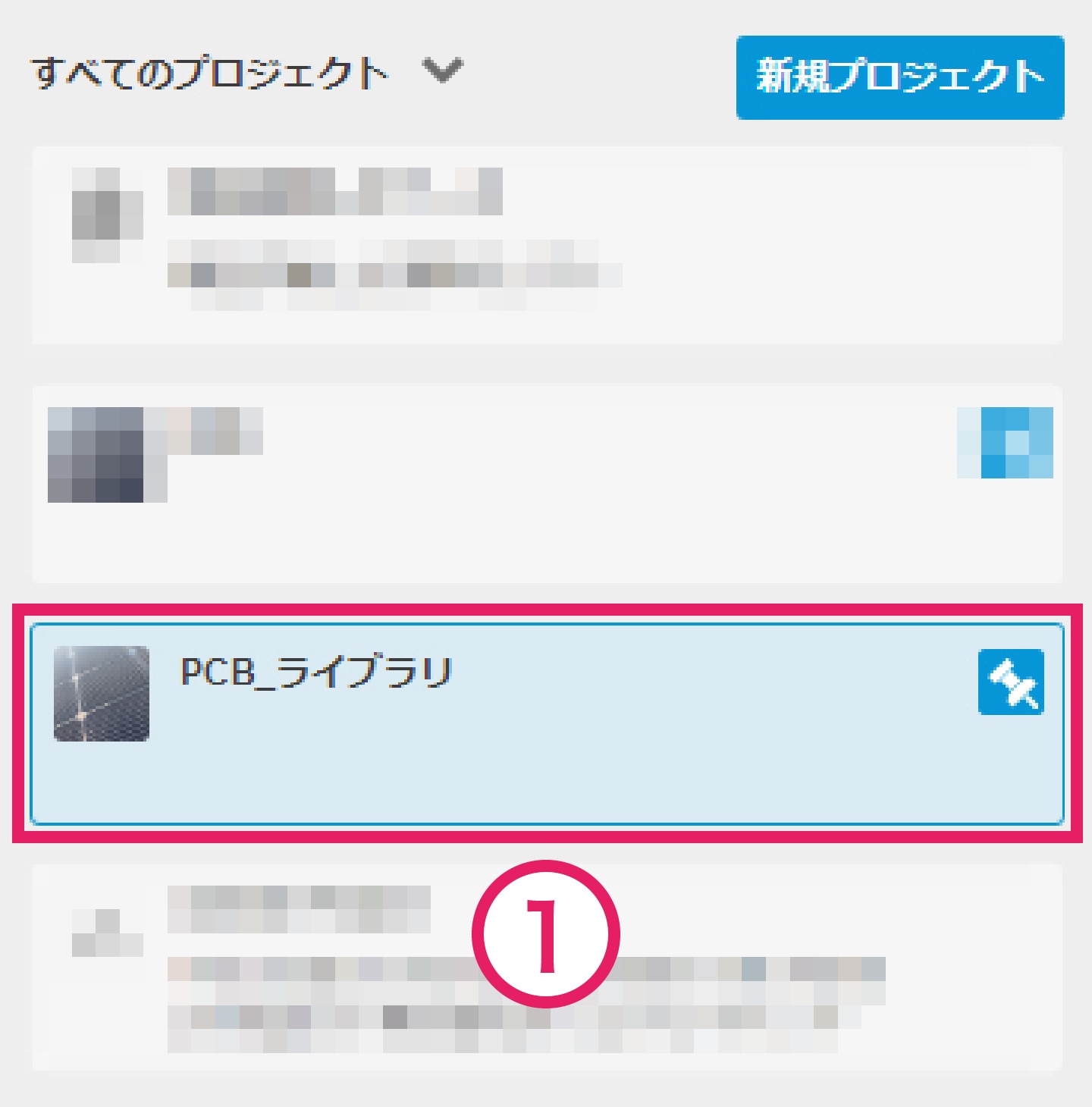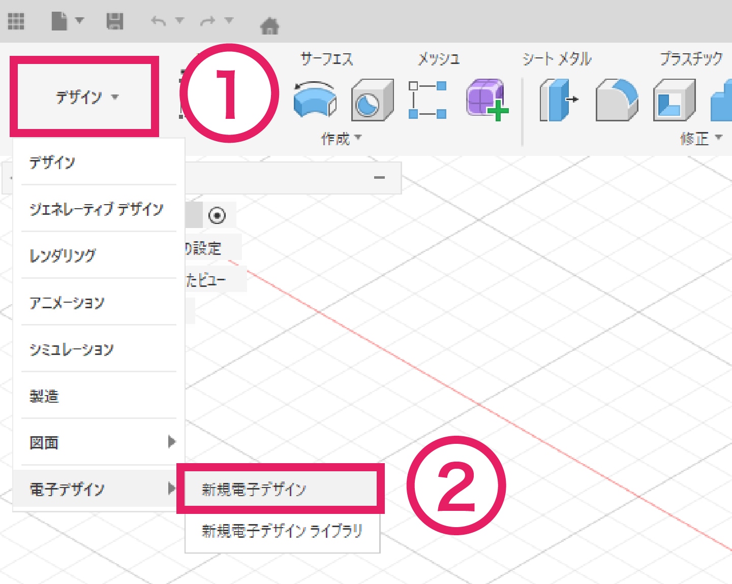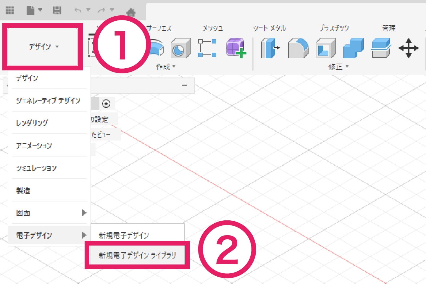 3-2-1 画面左上の作業スペースの変更より「デザイン」から 「新規電子デザインライブラリ」に切り替えます。
