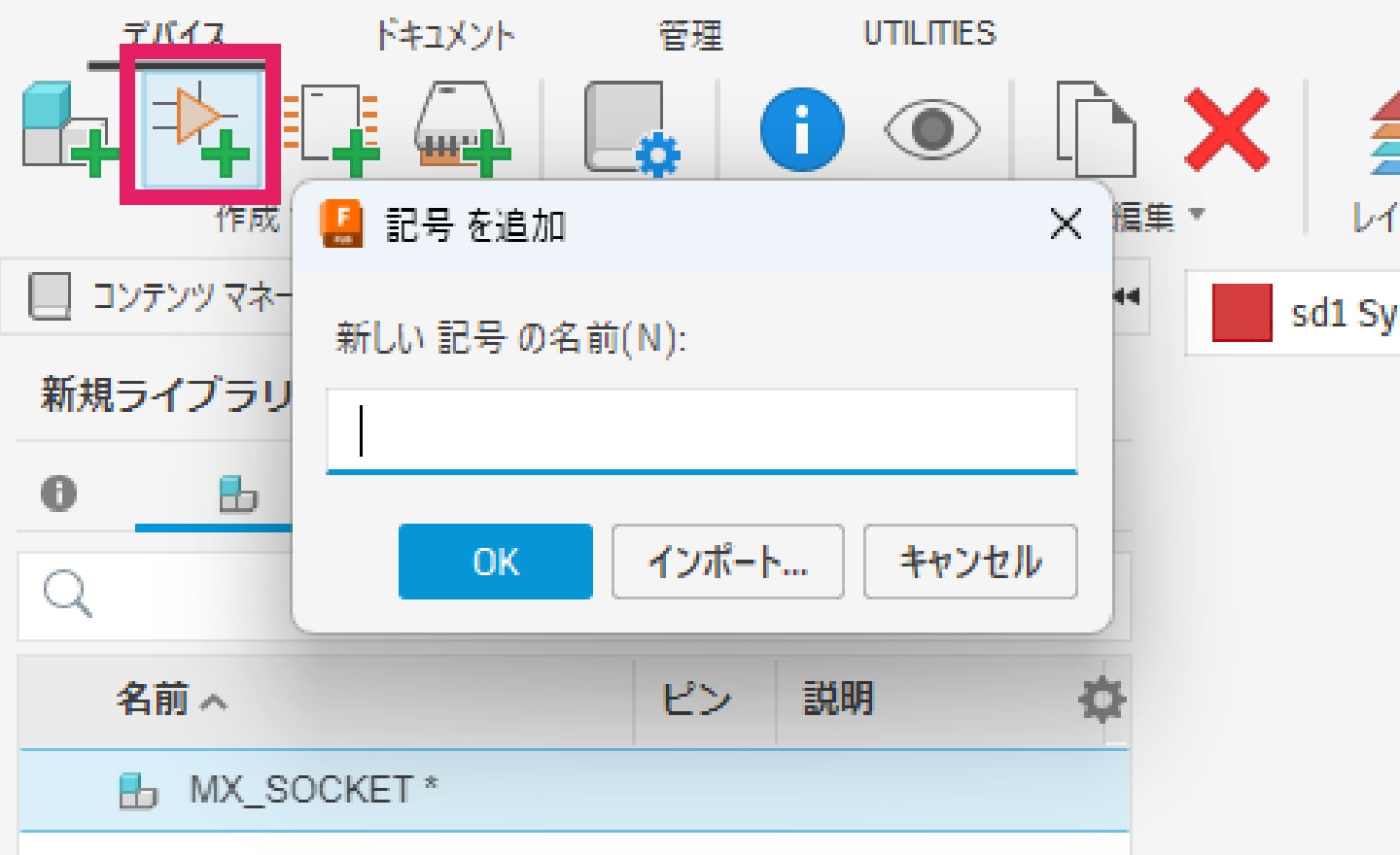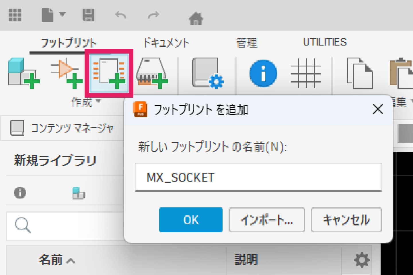 3-3-1|画面左上の[作成]タブより「新規フットプリント」コマンドを選択し、シンボルと同じように名前を付けます。