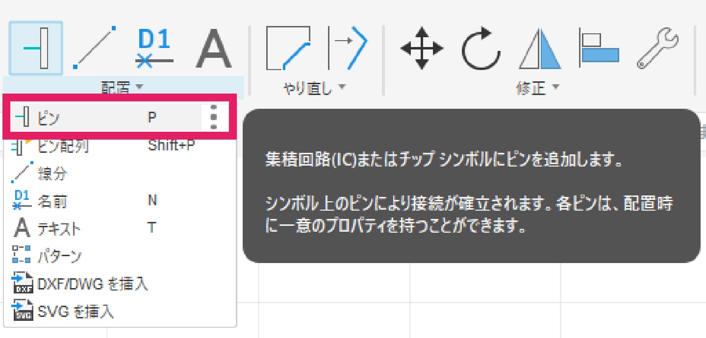 3-2-3|[配置]タブより「ピン」コマンドを選択し、ピンを追加していきます。