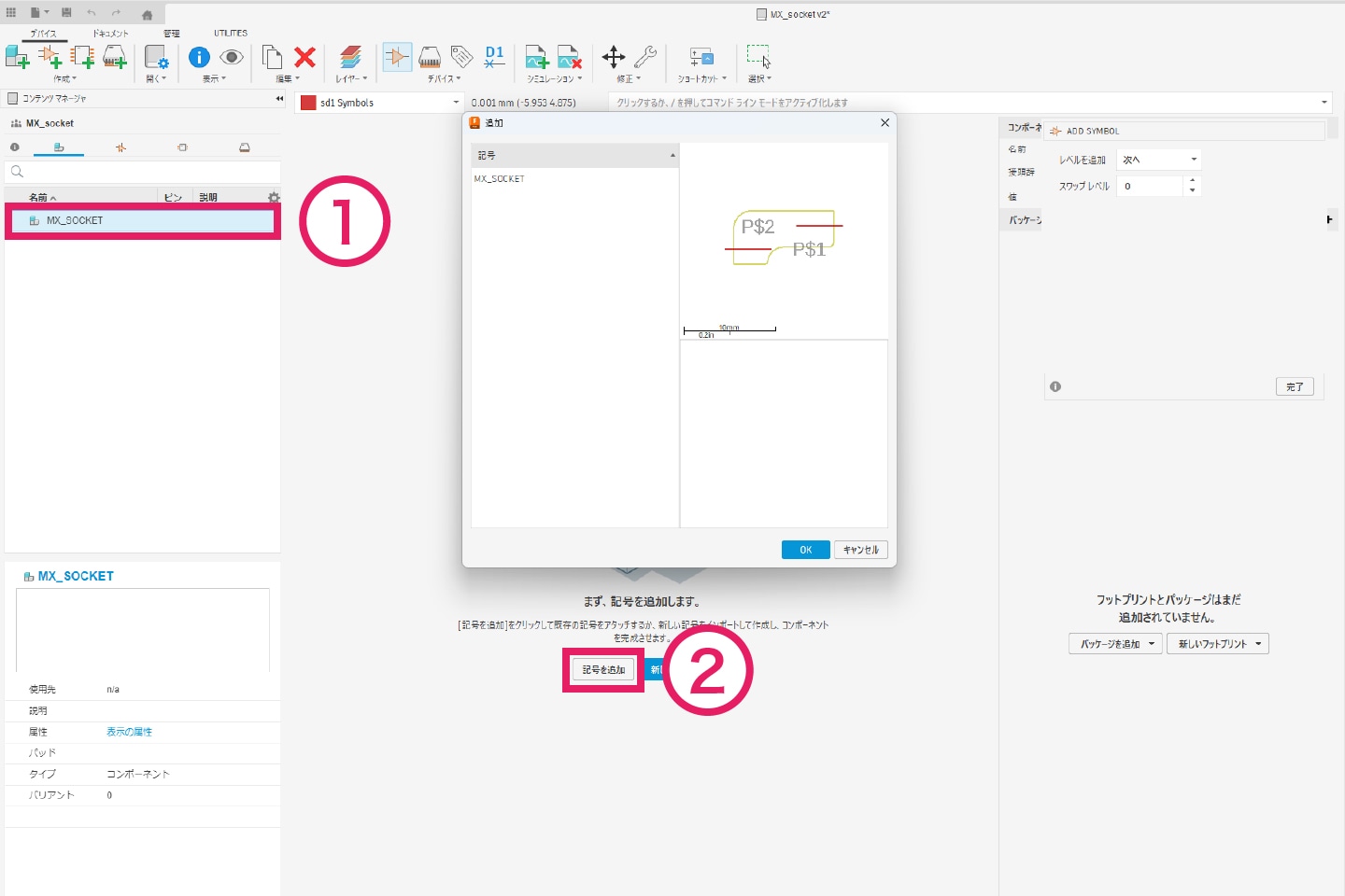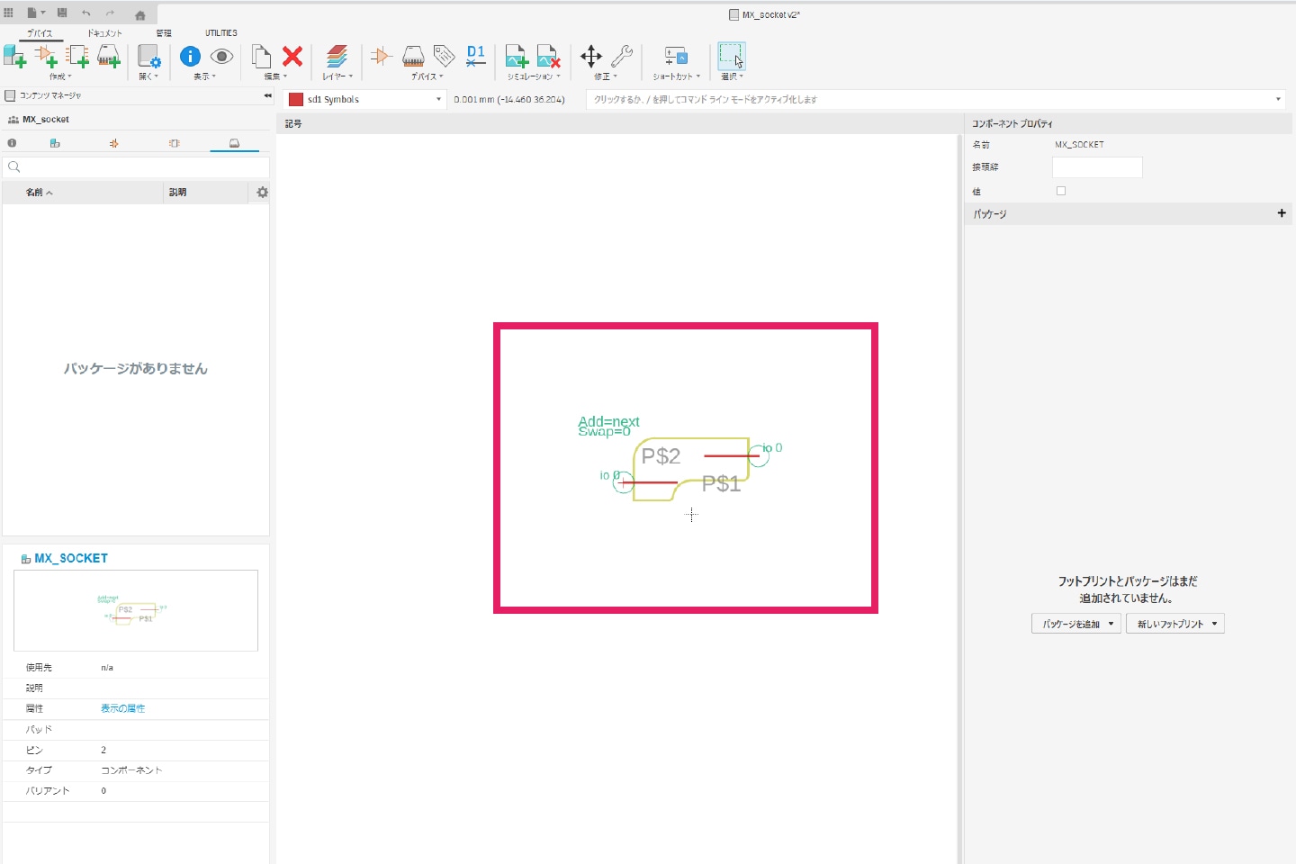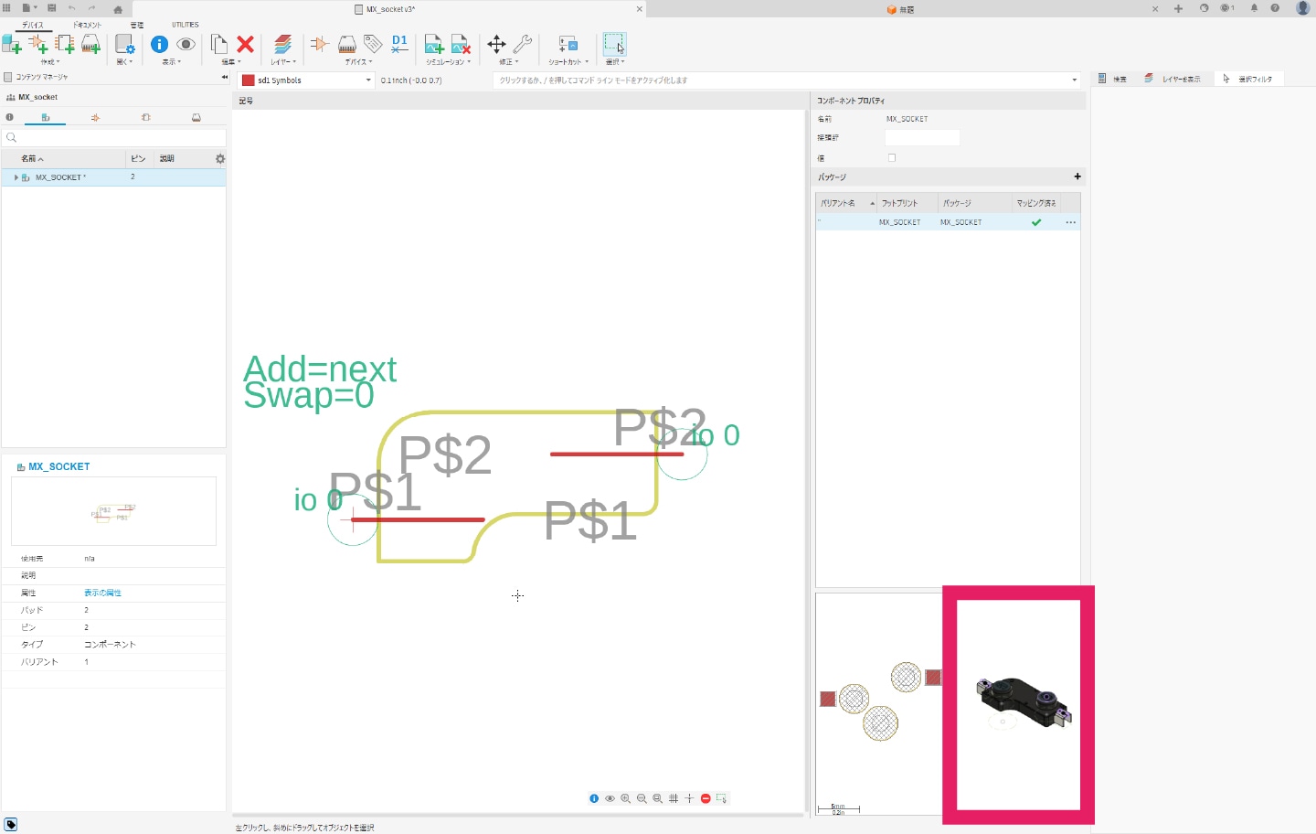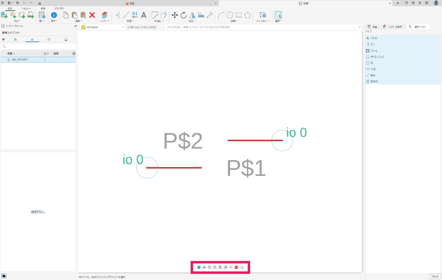画面右側の「コンポーネントを配置」から、作成したライブラリを選択します。作成したライブラリが読み込まれると、下図のように表示されます。その後、表示されたコンポーネントをドラッグ&ドロップすることでシンボルを配置できます。