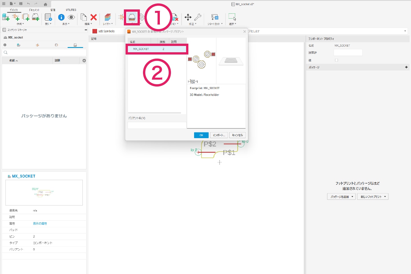 3-4-3[デバイス]タブより「Add Package」をクリックし、 先ほど作成したフットプリントを選択します。
