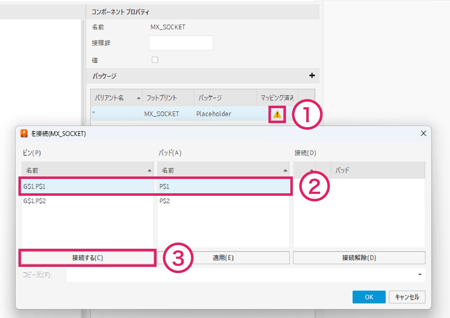 3-4-4 エラーマークをクリックすると、シンボルのピンとフットプリントのパッドを紐づける画面が表示されます。 対応するピンとパッドを選択し、「接続する」をクリックします。