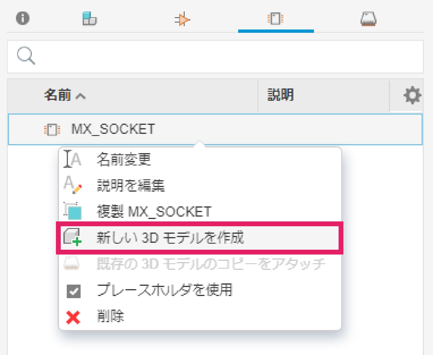 3-5-1|コンテンツマネージャーでフットプリントを右クリックし、「新しい3Dモデルを作成」を選択します。