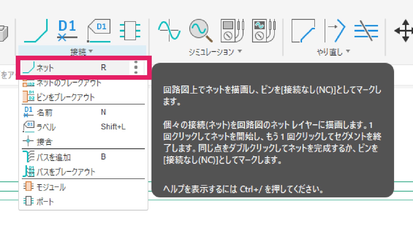必要な数のシンボルを配置したら、[接続]タブより「ネット」コマンドを選択して、接続したいピン同士を結んでいきます。すべて接続できたら、回路図の完成です。
