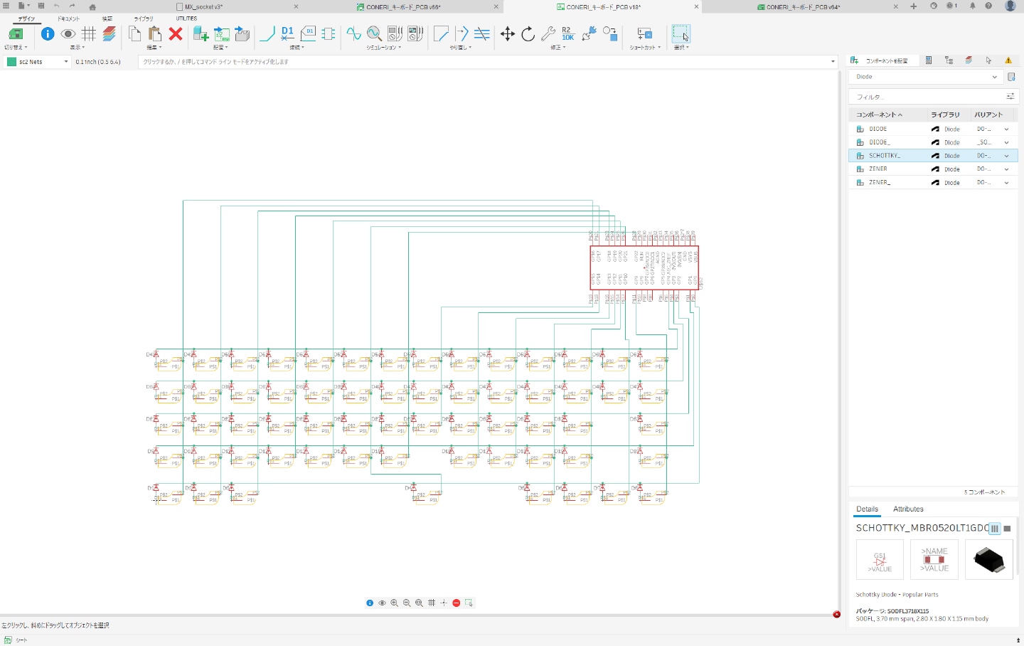 「Fusion」には多くの電子部品が標準ライブラリとして用意されていますが、作成したい基板に使用する部品が、標準ライブラリに含まれていない場合があります。本記事で例として扱うキーボード基板では、以下の部品を自作コンポーネントとして用意しました。