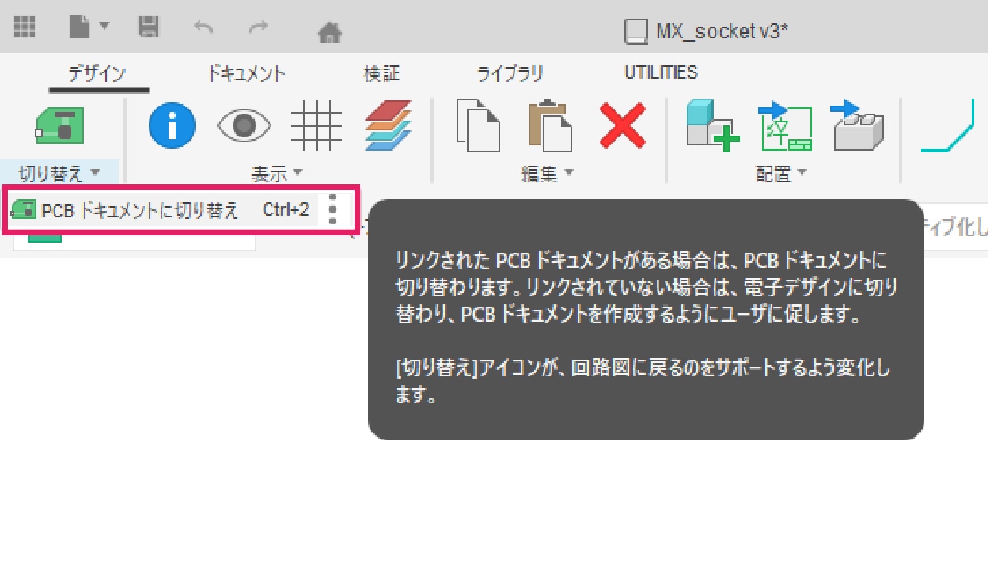回路図作成後に、画面左上の[切り替え]タブより「PCBドキュメントに切り替え」を選択します。