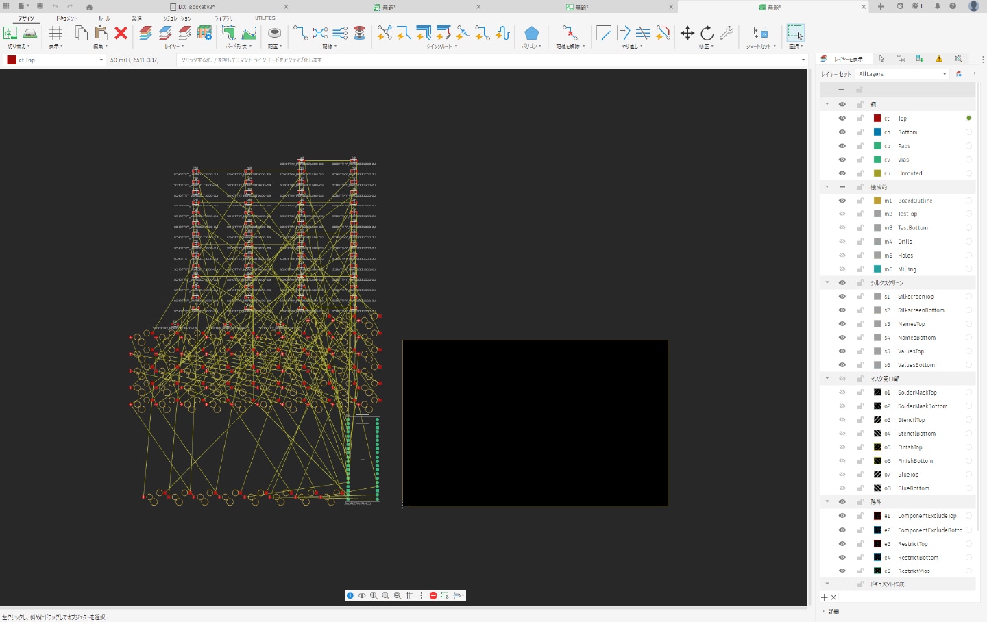 部品を基板上に配置し、配線を行うための設計画面。
