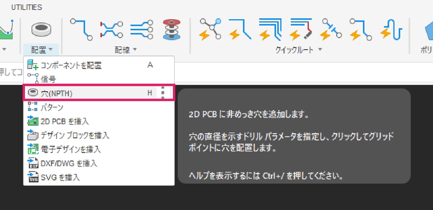 5-3-2|[配置]タブより「穴(NPTH)」コマンドを選択し、ねじ穴などを配置します。