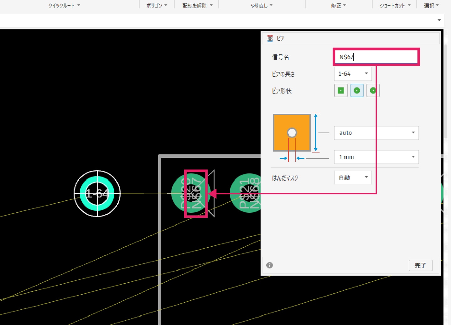 5-4-1|[配線]タブより「ビア」コマンドを選択します。穴径、ビア形状を設定し、信号名を繋ぎたいピンの信号名に合わせて配置します。