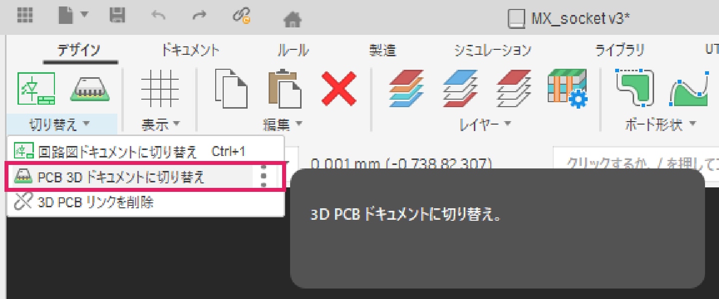 配線完了後、[切り替え]タブより「PCB 3D ドキュメントに切り替え」を選択して3D表示に切り替え、干渉や配置の問題がないか確認します。