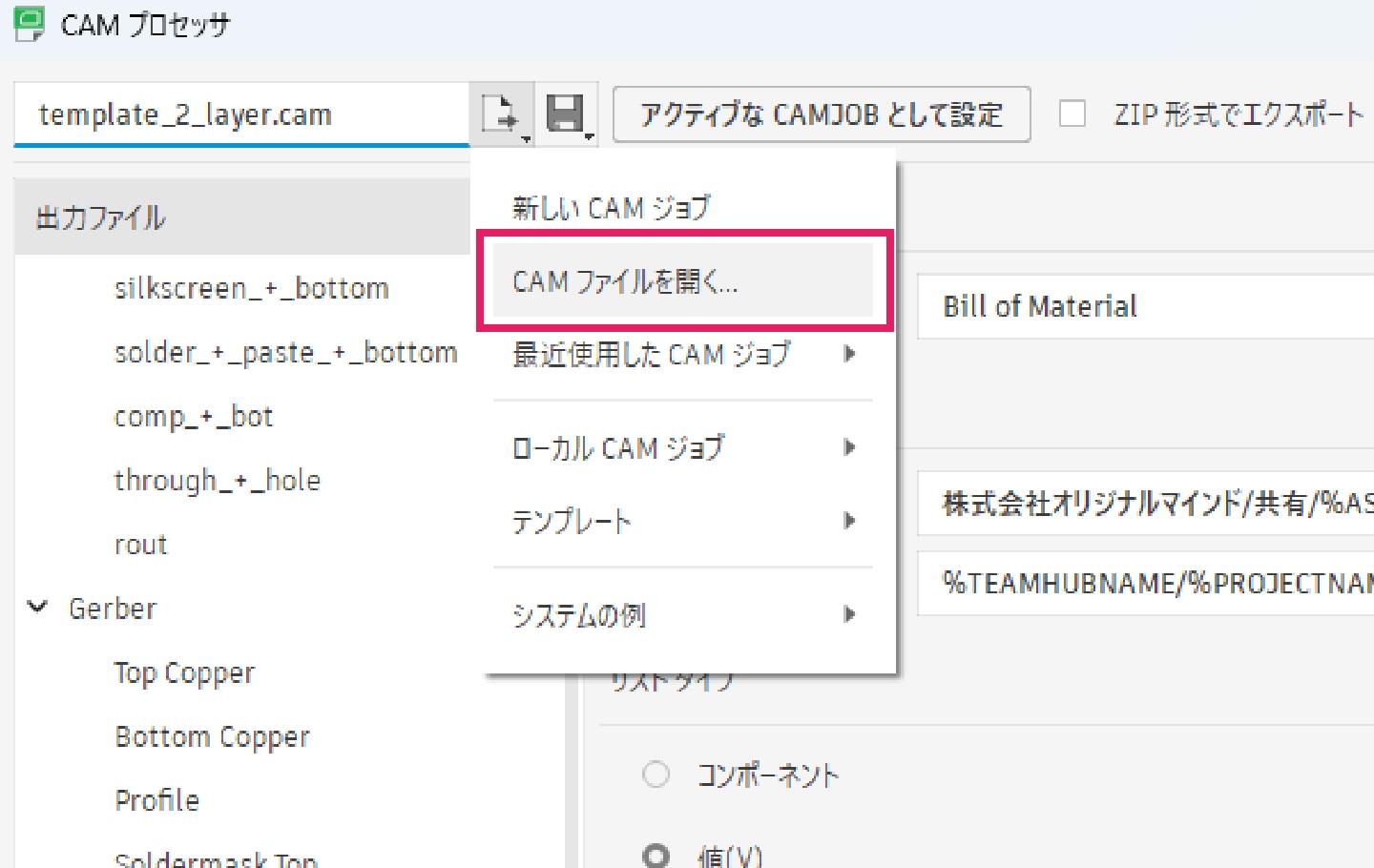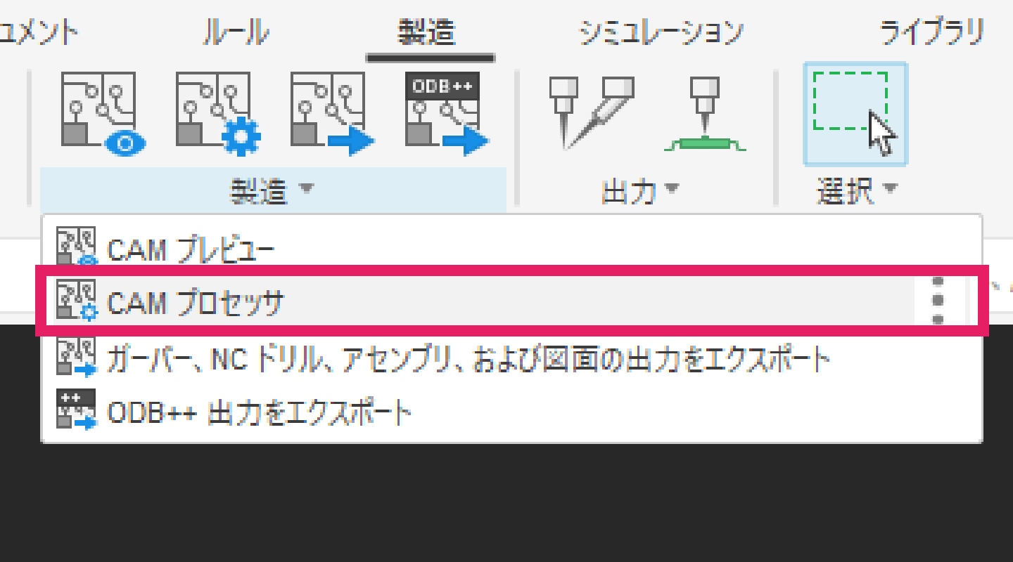 PCBドキュメントを開いた状態で、[製造]タブ内の「CAM プロセッサ」を選択します。ここから、ガーバーデータの出力設定を行います。