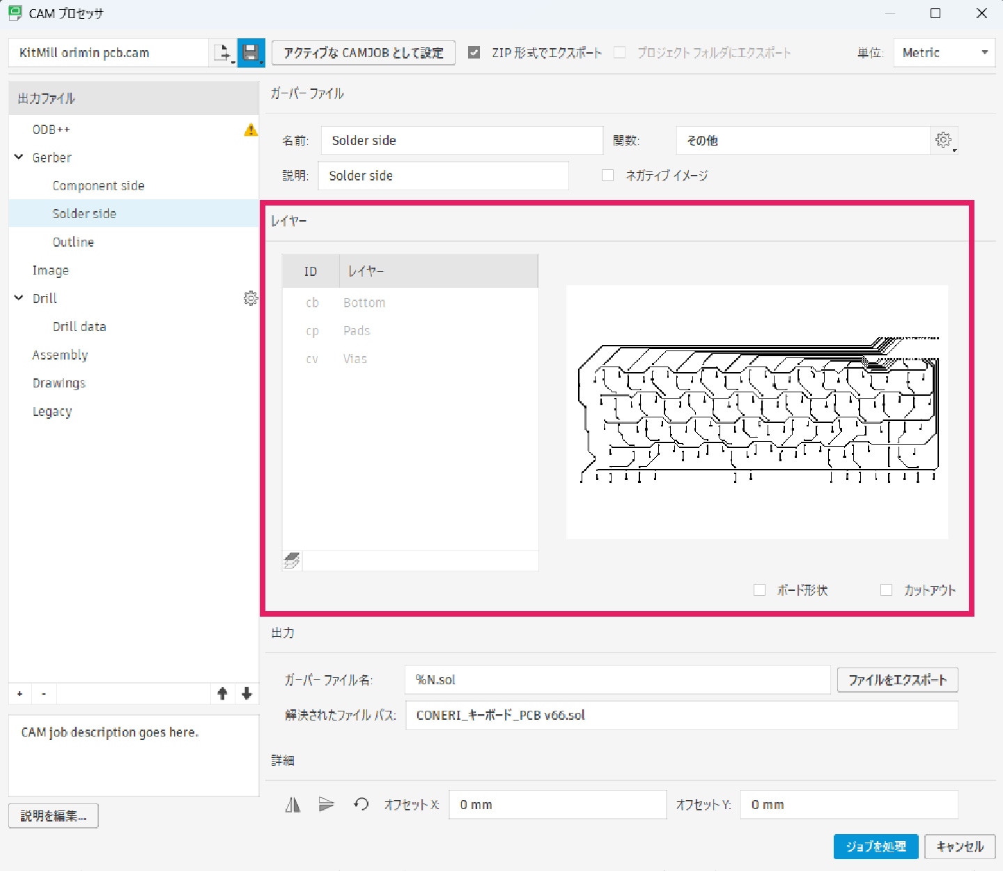 設定とプレビューの確認ができたら、「ジョブを処理」をクリックします。指定したフォルダに、各ガーバーデータが出力されていることを確認します。これで、基板設計からガーバーデータの出力までの一連の工程が完了しました。