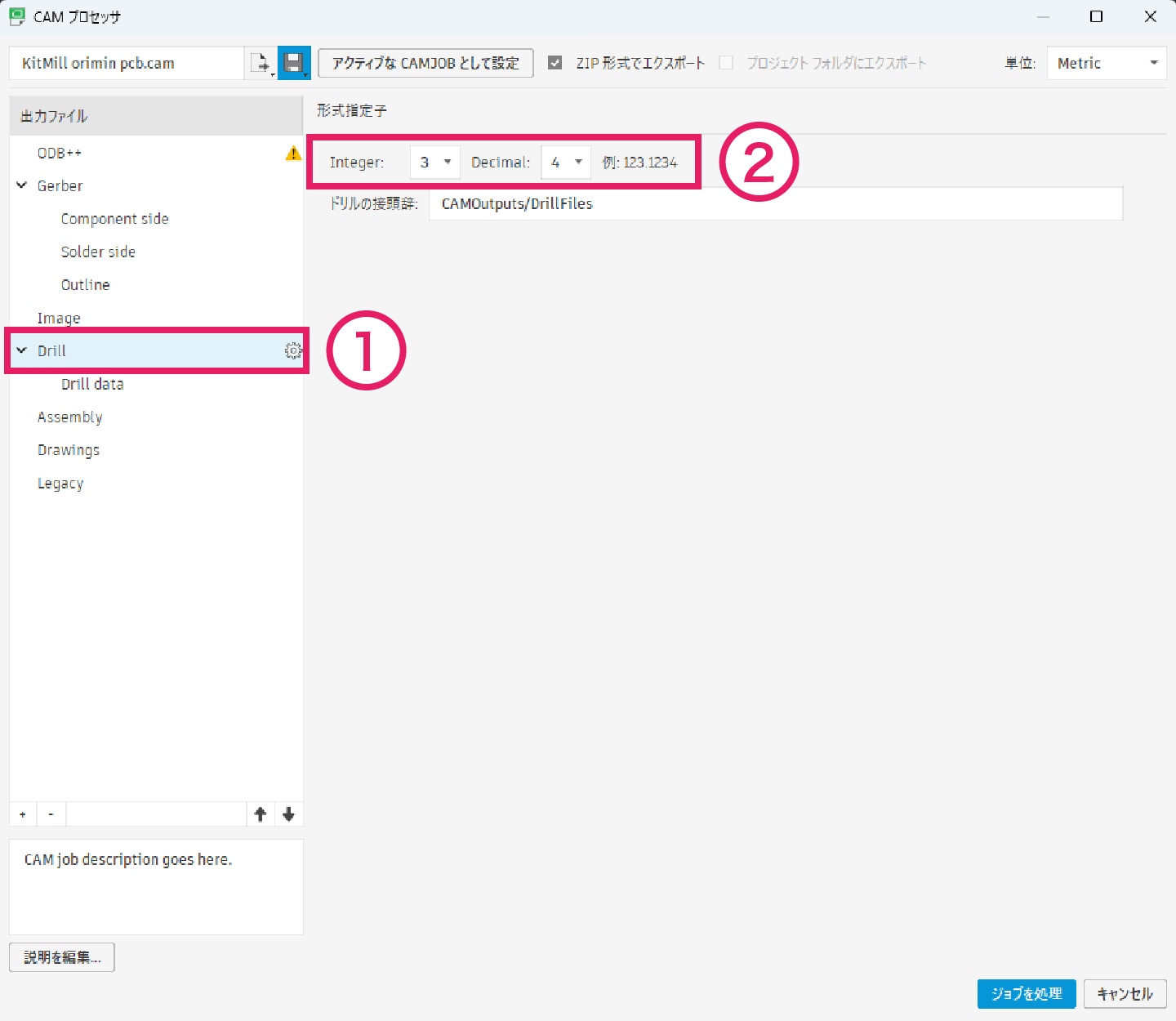 もしドリルの形式指定子を変更したい場合は、「出力ファイル」内の「Drill」を選択し、 「Integer:3」、「Decimal:4」 となっている数値を変更してください。