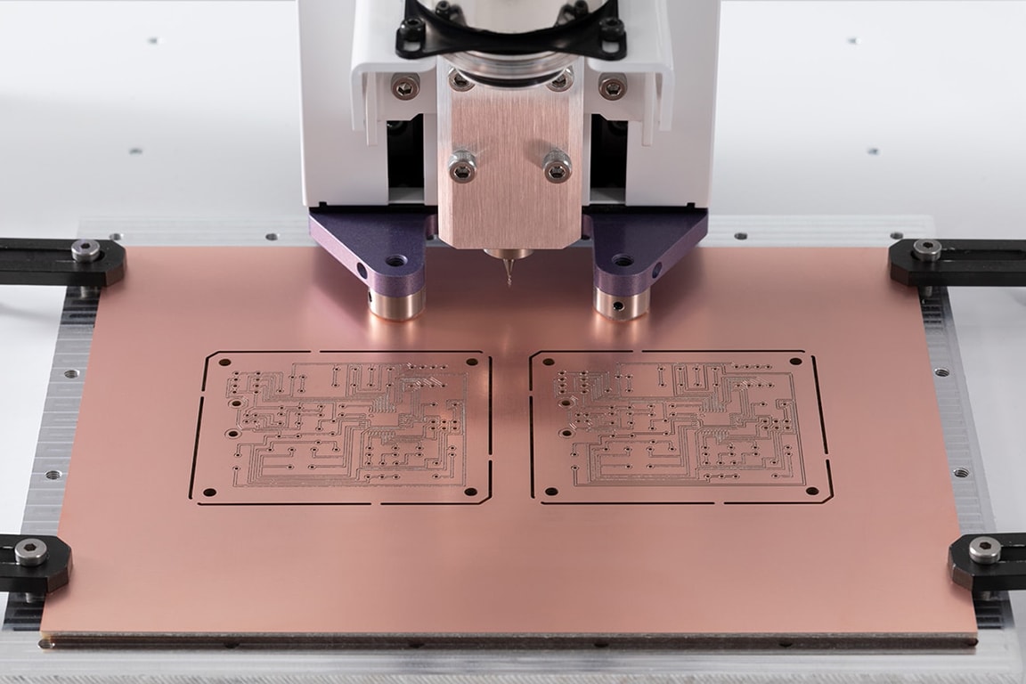 この後、出力したガーバーデータを NCプログラムに変換すれば、「基板加工アタッチメント」を取り付けた「KitMill BS100/200」および「KitMill CL100/200/420」で基板の加工が可能です。基板加工アタッチメントは「KitMill BS」および「KitMill CL」のオプション品として単品でご購入いただけるほか、加工機本体とセットでご購入いただける「基板加工オススメセット」もご用意しております。